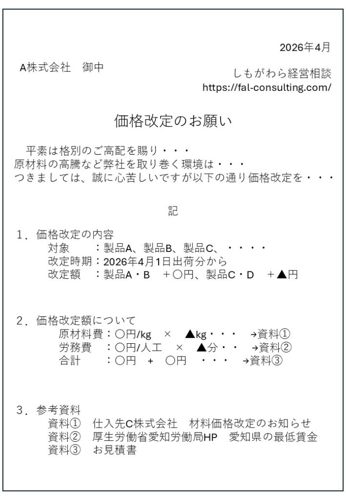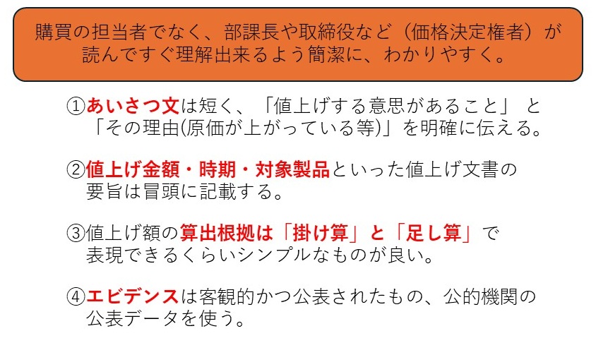 ここで重要なのは、「原価(材料費・労務費・経費のいずれか)が上がっていること」と、「値上げする意思があること」の2点を明確にすることです。この2点さえ伝わっていれば十分で、それ以外は不要。極力シンプルにすべきです。