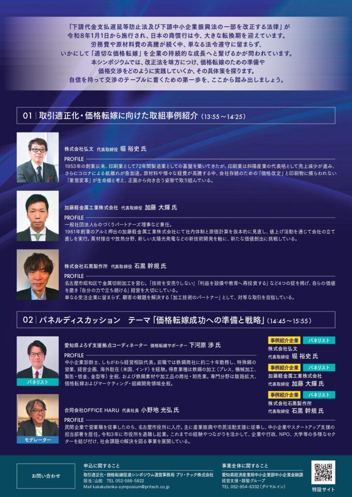 このシンポジウムは、価格転嫁の状況や価格交渉を後押しする法改正に関する情報提供、価格転嫁に取り組む企業による講演・パネルディスカッションを通じて、価格交渉を始めるきっかけの場として、愛知県を中心とした各団体により主催されます。
