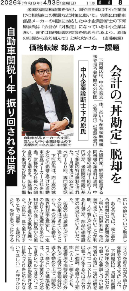 2026年4月3日(金)付の中日新聞 経済面(11版・8面)に、代表コンサルタント・中小企業診断士 下河原渉のインタビュー記事が掲載されました。